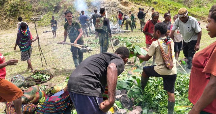 INTAN JAYA - Di tengah gemuruh perayaan Natal 2025 di Distrik Homeyo, Kabupaten Intan Jaya, Papua Tengah, tradisi bakar batu yang digelar Satgas Pamtas RI–PNG Mobile Yonif 113/Jaya Sakti (JS) menjadi perekat kehangatan dan kebersamaan yang tak ternilai. Bukan sekadar seremoni, kegiatan yang berlangsung di pos-pos seperti Pogapa, Bilai, Agapa, Zanepa, Engganengga, dan Maya pada Jumat (26/12/2025) ini merupakan wujud syukur dan upaya tulus menyatukan prajurit TNI dengan denyut kehidupan masyarakat lokal.