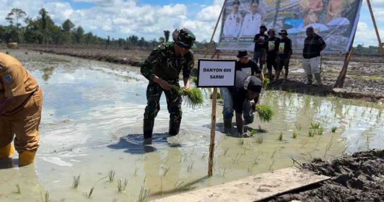 SARMI, PAPUA — Dalam rangka mendukung Program Strategis Nasional (PSN) bidang ketahanan pangan, prajurit Batalyon Infanteri TP (Yonif TP) 809/NTM turut serta dalam kegiatan Penanaman Perdana Komoditas Padi dan Cetak Sawah Rakyat (CSR) tahun 2025 di Kampung Tetom Jaya, Distrik Bonggo, Kabupaten Sarmi, pada Sabtu (13/12/2025).