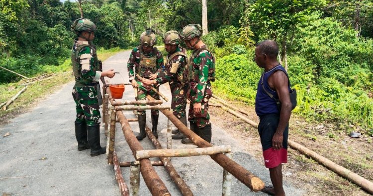 MAYBRAT - Di tanah perbatasan yang sarat akan makna, semangat kebersamaan antara prajurit TNI dan masyarakat kembali membara. Minggu (1/2/2026), personel Satgas Pamtas RI–PNG Mobile Yonif 10 Marinir/SBY bersama warga Kampung Sorry, Distrik Aifat Timur, Kabupaten Maybrat, Papua Barat Daya, bahu-membahu membangun sebuah gapura. Tangan-tangan yang terbiasa memegang senjata kini terampil mengangkut material dan merajut konstruksi, sementara warga setempat memberikan dukungan penuh. Kegiatan ini merupakan bagian dari upaya memperkuat persatuan dan menumbuhkan rasa memiliki terhadap kampung halaman.