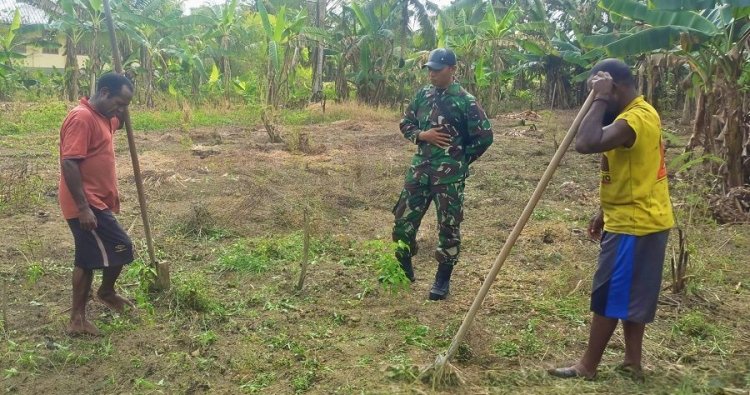 Jayapura – Dalam rangka mempererat hubungan kemitraan dengan masyarakat serta mendukung ketahanan pangan berbasis lingkungan, Babinsa Kodim 1701/Jayapura, Sertu Jailani bersama Serda Yosep Manan, melaksanakan kegiatan anjangsana sekaligus membantu penyiapan lahan pekarangan Gereja GIDI Jemaat Asia. Kegiatan tersebut berlangsung di Kampung Dukwia, Distrik Arso Barat, Kabupaten Keerom, Rabu (21/1/2026).