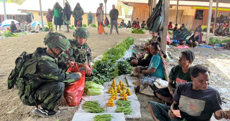 Dengan langkah penuh semangat, para prajurit menyusuri setiap sudut Pasar Tradisional Sinak. Deretan lapak yang dijaga oleh para mama Papua dan petani lokal menjadi tujuan mereka. Tangan-tangan terampil mereka memborong sayuran segar, umbi-umbian yang melimpah, buah-buahan ranum, dan berbagai hasil kebun lainnya. Bukan sekadar membeli, namun setiap transaksi diiringi senyum hangat, sebuah bentuk dukungan nyata yang langsung terasa oleh denyut ekonomi masyarakat.