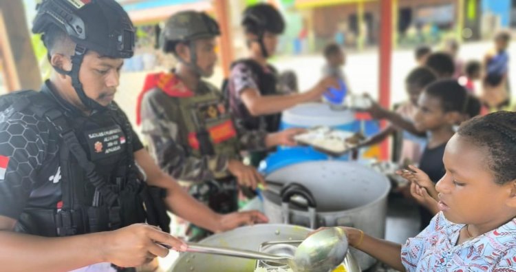 NDUGA - Di tengah heningnya rimba Pegunungan Jayawijaya, Kabupaten Nduga, Papua Tengah, suara tawa dan semangat belajar anak-anak SD Rimba YPPK Yan Smith Mumugu 2 mendapatkan suntikan energi baru. Kamis (27/11/2025) pagi, Satgas Pamtas RI–PNG Mobile Yonif 733/Masariku meluncurkan program "Masariku Peduli Gizi", membawa kehangatan dari dapur pos mereka langsung ke meja makan ratusan siswa.
