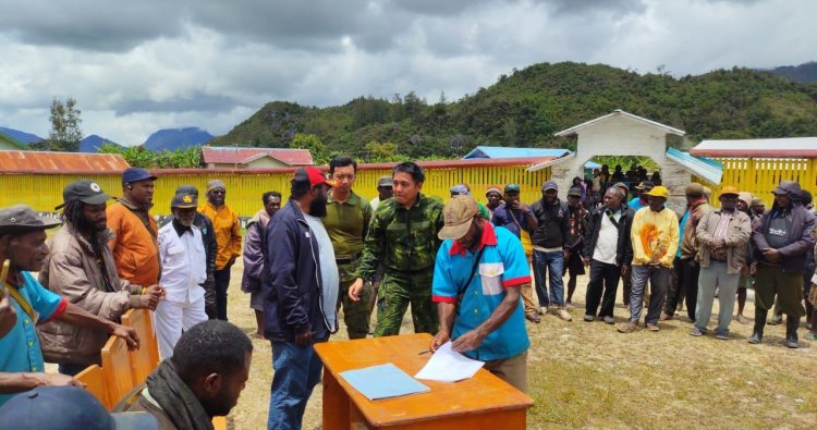 PANIAI - Di tengah tantangan komunikasi dan dinamika sosial masyarakat pegunungan Papua, prajurit Satgas Pamtas RI-PNG Mobile 2025 Yonif 4 Marinir menunjukkan bahwa kedamaian dapat diraih tanpa senjata, melainkan dengan hati. Melalui pendekatan musyawarah adat yang humanis, pasukan baret ungu itu berhasil membuka kembali kepercayaan masyarakat Distrik Pasir Putih, Kabupaten Paniai, yang semula sempat menolak kehadiran mereka.
