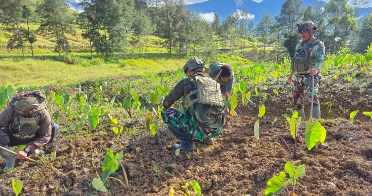 Di lahan kebun sederhana milik warga, prajurit berseragam loreng dan masyarakat setempat membaur tanpa sekat. Mereka mencangkul tanah, menanam bibit keladi, dan saling berbagi canda di sela kerja. Di hadapan hamparan tanah subur Pegunungan Papua, tumbuh nilai kebersamaan yang melampaui sekat perbedaan.