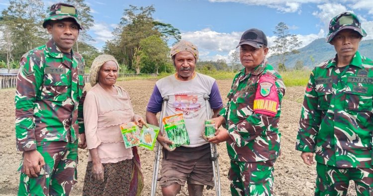 Wamena - Dalam rangka mendukung program pemerintah di bidang ketahanan pangan serta meningkatkan kesejahteraan masyarakat, Satuan Tugas TNI Manunggal Membangun Desa (Satgas TMMD) ke-126 Kodim 1702/Jayawijaya melaksanakan kegiatan pemberian bantuan benih hortikultura kepada warga Kampung Algonik, Distrik Pyramid, Kabupaten Jayawijaya, Provinsi Papua Pegunungan, Minggu (19/10/2025).