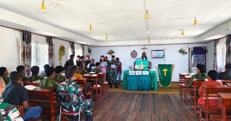 Alunan pujian mengalun merdu, menggema dalam Bahasa Indonesia maupun dialek lokal, diiringi petikan gitar akustik dari pemuda gereja. Di dalam ruang ibadah, tak ada lagi sekat protokoler militer. Yang terlihat hanyalah semangat persatuan dan kerukunan.