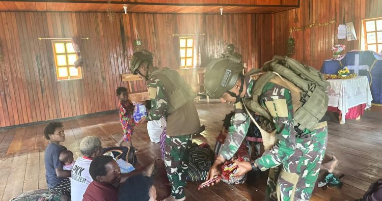 PUNCAK - Minggu pagi di Kampung Mamere, Distrik Beoga, Kabupaten Puncak, Papua Pegunungan, pada (30/11/2025), menjadi saksi bisu kehangatan yang melampaui batas geografis dan tugas keamanan. Di halaman gereja yang diselimuti embun pegunungan, para prajurit Satgas Pamtas RI-PNG Mobile Yonif 732/Banau Pos Jenggeren duduk berdampingan dengan warga, menyatukan doa, dan kemudian menyalurkan bantuan biskuit serta sembako. Momen ini bukan sekadar rutinitas ibadah, melainkan bukti nyata bahwa penjagaan perbatasan tak hanya soal operasi militer, namun juga tentang sentuhan sosial yang memanusiakan.