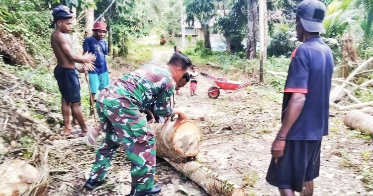 Keerom – Peran aktif Babinsa Koramil 1701-07/Web, Kopka Sriyanto, kembali diwujudkan dalam aksi nyata melalui gotong royong bersama warga masyarakat membersihkan batang pohon besar yang tumbang dan menutup akses jalan di Kampung Umuaf, Distrik Web, Kabupaten Keerom, Selasa (11/11/2025).