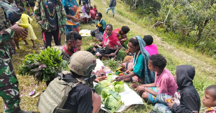Tak berhenti di situ, kebersamaan semakin terasa usai ibadah. Di halaman gereja, para mama Papua dengan bangga menjajakan hasil bumi mereka. Dari sayur-mayur segar hingga ubi dan aneka buah, semua menjadi saksi bisu jerih payah warga. Dengan penuh semangat, prajurit Satgas Yonif 712/Wiratama memborong seluruh hasil tani tersebut, sebuah gestur nyata yang memberikan dorongan berarti bagi perekonomian lokal.