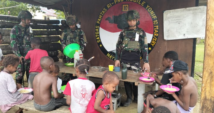 PAPUA BARAT DAYA - Suasana penuh keceriaan menyelimuti Pos Ayata pada Kamis (20/11/2025) ketika Satgas Pamtas RI-PNG Mobile Yonif 10 Marinir/SBY menggelar kegiatan makan bersama anak-anak Kampung Ayata, Distrik Aifat Timur, Kabupaten Maybrat, Papua Barat Daya. Program sederhana namun sarat makna ini menjadi wujud nyata pendekatan humanis TNI AL di wilayah perbatasan.
