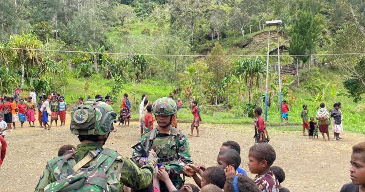 Di tengah aktivitas belajar dan bermain, kedatangan prajurit TNI membawa warna baru. Anak-anak berlari menyambut dengan senyum lebar, tangan-tangan mungil mereka terulur penuh semangat. Pemandangan itu menciptakan suasana haru yang menyentuh seolah kebahagiaan sederhana menjadi jembatan kasih antara TNI dan masyarakat pedalaman Papua.