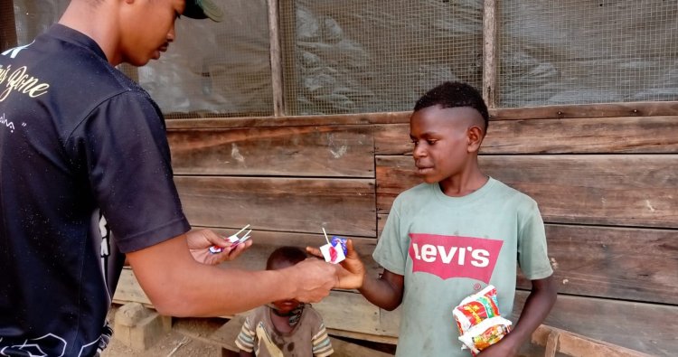 Usai kegiatan Komsos, personel Satgas Yonif 113/JS membagikan makanan ringan berupa roti, mi instan, dan permen kepada anak-anak Kampung Zanepa. Aksi berbagi tersebut disambut antusias oleh anak-anak yang tampak gembira menerima perhatian dari para prajurit.