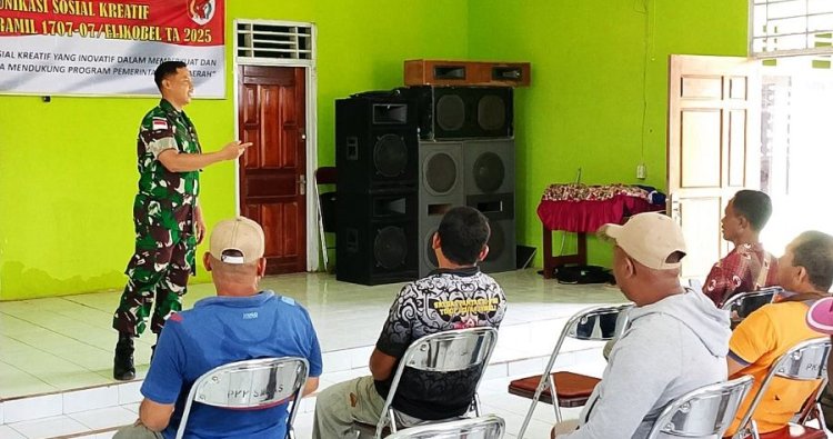 Kegiatan yang berlangsung mulai pukul 08.00 WIT tersebut mengusung tema “Peran Komunikasi Sosial Kreatif yang Inovatif dalam Memperkuat Karakter Bangsa Guna Mendukung Program Pemerintah RI di Daerah” dan dipimpin langsung oleh Bati Tuud Koramil 1707-07/Elikobel Pelda Agus Surahman. Puluhan warga tampak antusias mengikuti kegiatan tersebut.