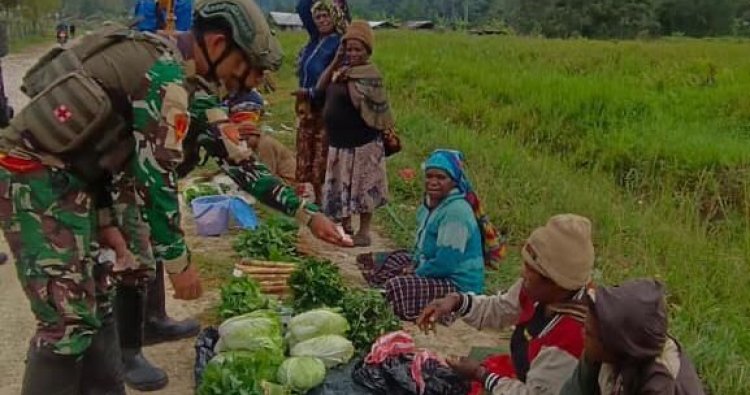 PAINAI - Di tengah hamparan hijau Distrik Komopa, Kabupaten Paniai, Rabu (18/2/2026), prajurit Satgas Pamtas RI-PNG Mobile 2025 Gobang V Yonif 4 Marinir tak hanya menjaga keamanan, namun juga merajut asa kesejahteraan bagi petani lokal. Mereka hadir bukan sebagai pembeli biasa, melainkan sebagai garda terdepan yang memborong hasil bumi warga, dari kangkung, bayam, hingga cabai dan aneka sayuran khas Papua.