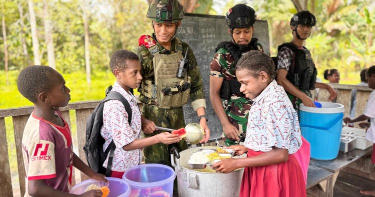 Langkah sederhana ini menjadi oase di tengah keterbatasan. Dengan semangat kepedulian, para prajurit berbaur bersama siswa, menyuapi mereka dengan nasi, lauk pauk, sayur, dan buah segar sebuah pemandangan yang menyejukkan hati di pelosok perbatasan.