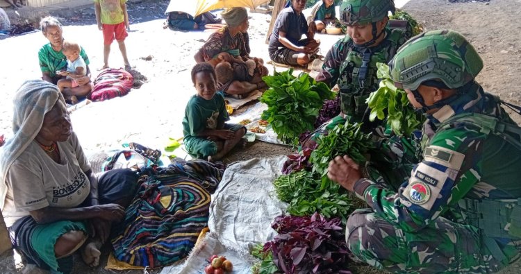 Kegiatan tersebut menjadi bukti nyata kehadiran TNI di tengah masyarakat, tidak hanya menjaga keamanan wilayah, tetapi juga membantu menggerakkan ekonomi lokal. Dengan semangat kebersamaan, para prajurit menyusuri setiap lapak warga dan memborong berbagai hasil bumi seperti ubi, sayuran, pisang, dan buah-buahan khas pegunungan Papua.