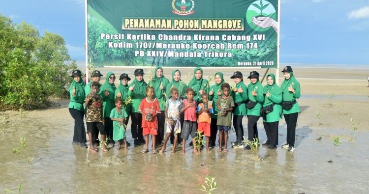 Merauke - Aksi nyata kepedulian terhadap lingkungan kembali ditunjukkan oleh Persit Kartika Chandra Kirana Cabang XVI Kodim 1707/Merauke Koorcab Rem 174 PD XXIV/Mandala Trikora melalui kegiatan penanaman pohon mangrove yang berlangsung di Pantai Payum, Kelurahan Samkai, Distrik Merauke, Kab. Merauke - Provinsi Papua Selatan, pada Selasa pagi (21/04/2026). Kegiatan dipimpin langsung oleh Ketua Persit Ny. Asti Dili Eko Setyawan didampingi Dandim 1707/Merauke Letkol Czi Dili Eko Setyawan, S.Ak., M.Han.