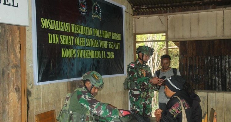 Sebagai bentuk kepedulian terhadap kesehatan masyarakat di perbatasan RI-PNG, Satgas Pamtas RI-PNG Statis Yonif 753/AVT Pos Kiwirok berikan penyuluhan kesehatan kepada warga binaan pos di Balai Desa, Distrik Kiwirok, Pegunungan Bintang. Jumat (23/01/2026).