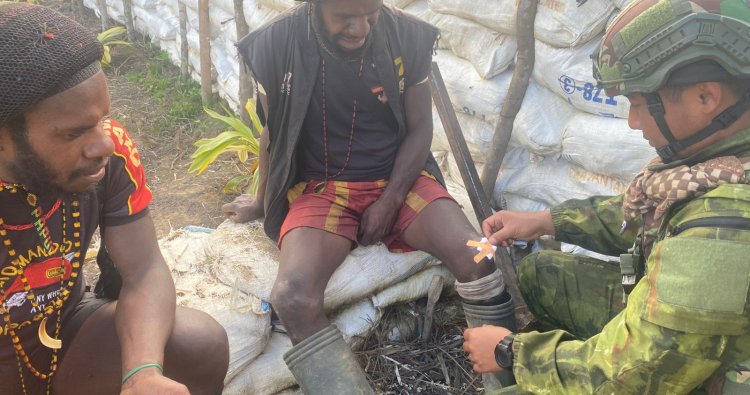 Tak perlu menunggu lama, kepedulian terpancar dari personel Satgas. Pemeriksaan awal, pembersihan luka, hingga penanganan medis sesuai prosedur lapangan segera dilakukan. Tindakan sigap ini bukan sekadar perawatan luka, melainkan sentuhan kemanusiaan yang menghadirkan rasa aman di hati warga yang terbiasa berjuang melawan keterbatasan.