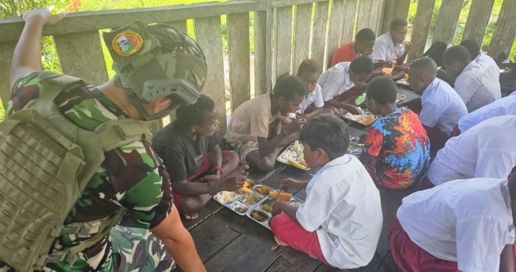 ASMAT - Di tengah keheningan pedalaman Distrik Krepkuri, Kabupaten Asmat, sebuah pemandangan hangat menyapa di halaman SD Rimba YPPK Yan Smith Mumugu 2. Puluhan anak dengan seragam sederhana tak dapat menyembunyikan senyum lebar mereka saat menyambut kehadiran prajurit Satgas Pamtas Mobile Yonif 733/Masariku. Bukan senjata yang mereka bawa, melainkan tumpukan piring yang siap diisi dengan makanan bergizi.