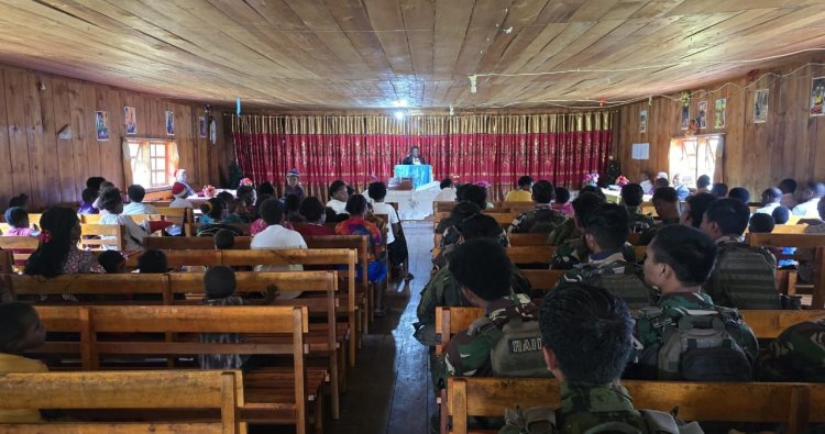 INTAN JAYA - Di tengah bentangan alam Intan Jaya yang memukau namun kerap diwarnai tantangan keamanan, sebuah pemandangan tak biasa tersaji di Gereja Kemah Injil Indonesia (GKII) Kampung Hitadipa, Distrik Hitadipa, pada Minggu, (7/12/2025). Prajurit Satuan Tugas (Satgas) Yonif 712/Wiratama tak ragu melepas atribut tempur sejenak, duduk berdampingan dengan warga lokal, menyatukan hati dalam kebaktian Minggu yang khidmat.