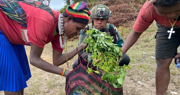 Selain memborong hasil panen, prajurit juga membagikan paket sembako, biskuit, serta permen kepada warga yang melintas bentuk kepedulian sederhana yang bermakna besar bagi masyarakat di pedalaman Papua.
