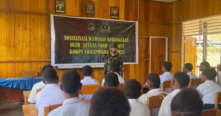 Di tengah-tengah keindahan alam Papua, Satgas Pamtas RI-PNG Statis Yonif 753/AVT menggelar sosialisasi wawasan kebangsaan bertempat di SMP Tinibil.