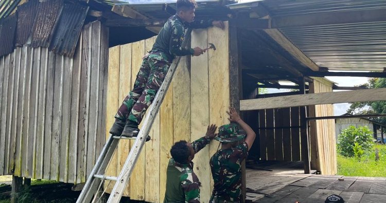Pegunungan Bintang - Dalam upaya membantu kesulitan warga di perbatasan, Satgas Pamtas RIa-PNG Statis Yonif 753/AVT Pos Batom melaksanakan renovasi rumah milik Bapak Obiet Kimki (47 th), warga Kampung Batom, Distrik Batom, Pegunungan Bintang, pada Sabtu (21/02/2026).