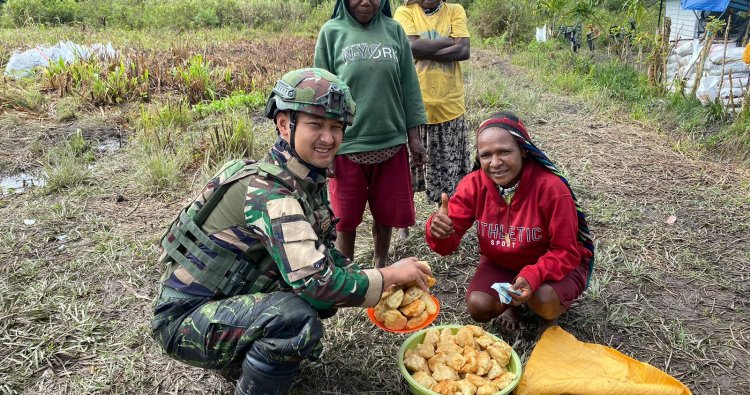 INTAN JAYA - Di tengah denyut kehidupan Kampung Bilai, Distrik Homeyo, Kabupaten Intan Jaya, Papua Tengah, personel Satgas Pamtas RI-PNG Mobile Yonif 113/JS di Pos Komando (TK) Bilai tak hanya menjaga perbatasan, namun juga merajut kehangatan melalui aksi sederhana namun bermakna. Mereka memilih pendekatan yang menyentuh langsung denyut nadi perekonomian warga, yakni dengan memborong dagangan para mama Papua yang datang menjajakan aneka makanan ringan di sekitar pos.
