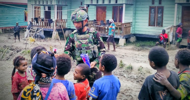 Begitu personel Satgas tiba dengan bungkusan penuh permen, seketika puluhan anak berlarian menyambut. Halaman kampung pun sontak dipenuhi gelak tawa bahagia saat mereka menerima suguhan manis tersebut, merasakan kehangatan dan perhatian yang jarang mereka dapatkan.