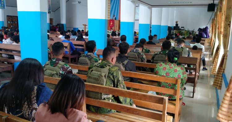 Dalam setiap doa dan pujian yang mengalun, para personel Satgas menunjukkan penghormatan mendalam, menyatu dengan jemaat dalam setiap rangkaian ibadah. Momen ini bukan sekadar tugas pengamanan, melainkan sebuah jembatan rohani dan kemanusiaan yang dibangun oleh TNI dengan masyarakat.