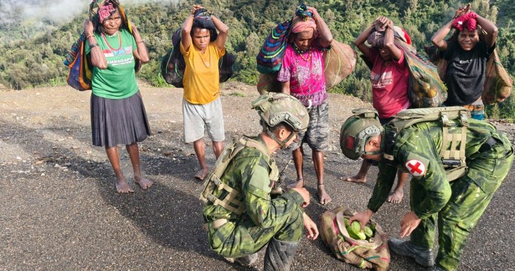 Sejak mentari pagi mulai menyapa, personel Satgas terlihat aktif menyusuri Jalan Poros Sugapa–Beoga, arteri vital yang menjadi urat nadi mobilitas warga. Para prajurit berinteraksi hangat dengan para mama Papua yang dengan bangga menjajakan hasil kebun mereka. Noken-noken berisi sayuran segar, buah-buahan ranum, hingga umbi-umbian yang melimpah, disambut dengan antusias oleh para prajurit. Kehadiran mereka tak hanya membuat pasar kian ramai, namun juga menciptakan rasa aman dan kelancaran bertransaksi bagi seluruh warga.