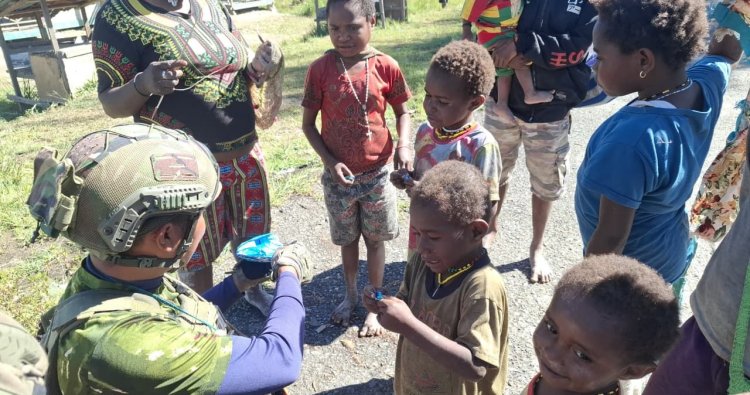 Dari pos-pos terdepan seperti Titik Kuat (TK) Bilogai, TK Silatuga, dan TK Mamba Kotis, para prajurit berinteraksi langsung dengan anak-anak. Gantungan permen dan mainan sederhana menjadi jembatan tawa, menghidupkan suasana di wilayah yang jarang tersentuh kemewahan hiburan. Tawa riang dan antusiasme mereka adalah bukti nyata betapa kehadiran TNI mampu membawa percikan kebahagiaan.