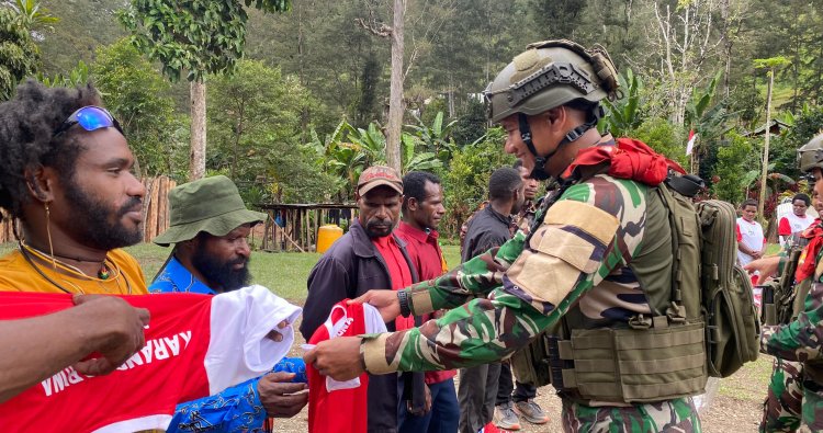 PUNCAK - Komitmen membangun kemandirian dan memperkuat sendi sosial masyarakat perbatasan terus ditunjukkan Pos Jampul Satgas Pamtas RI–PNG Mobile Yonif 732/Banau. Melalui program Sahabat Banau, Satgas mengukuhkan Karang Taruna dan PKK Kampung Jampul, yang dirangkaikan dengan pembagian pakaian layak pakai kepada warga, di Kampung Jampul, Distrik Beoga, Kabupaten Puncak, Jumat (26/12/2025).