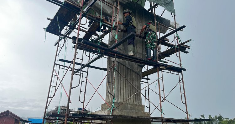 NDUGA - Di tengah sejuknya udara pegunungan dan semangat kebersamaan yang hangat, prajurit Satgas Yonif 733/Masariku bersama masyarakat Distrik Kenyam terus melanjutkan pembangunan Patung Yesus yang digadang menjadi ikon baru dan simbol kedamaian di Kabupaten Nduga.