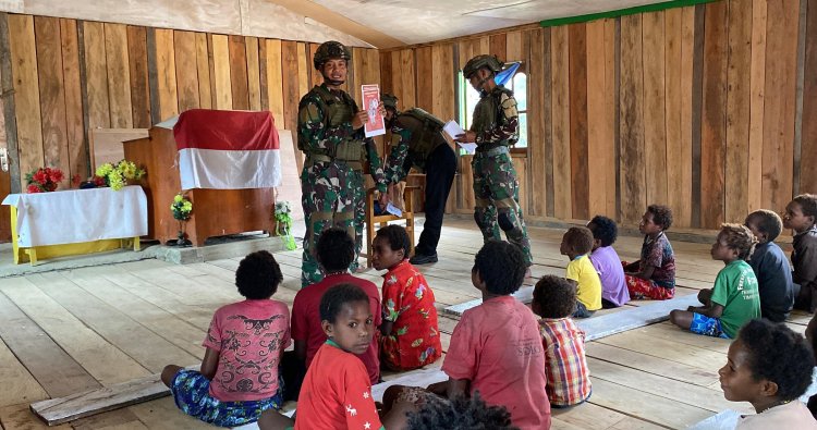 Sebanyak 15 personel Satgas, di bawah komando Kapten Inf M. Diyan Saputro, tak hanya menjalankan tugas pengamanan, tetapi juga merajut kebersamaan dengan anak-anak sekolah dan masyarakat sekitar. Melalui ragam permainan edukatif yang penuh tawa, lomba menggambar yang mengasah kreativitas, hingga lantunan lagu-lagu perjuangan yang menggugah jiwa, para prajurit TNI dengan hangat membangkitkan semangat juang dan rasa cinta tanah air.