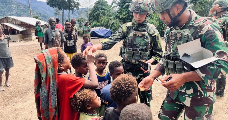 INTAN JAYA - Di tengah hamparan hijau dan keheningan pedalaman Papua Tengah, sebuah momen hangat terukir di Kampung Engganengga, Kabupaten Intan Jaya. Kehadiran personel Satgas Pamtas RI–PNG Mobile Yonif 113/Jaya Sakti di Pos Engganengga tidak hanya membawa misi pengamanan, tetapi juga kebaikan yang menyentuh hati.