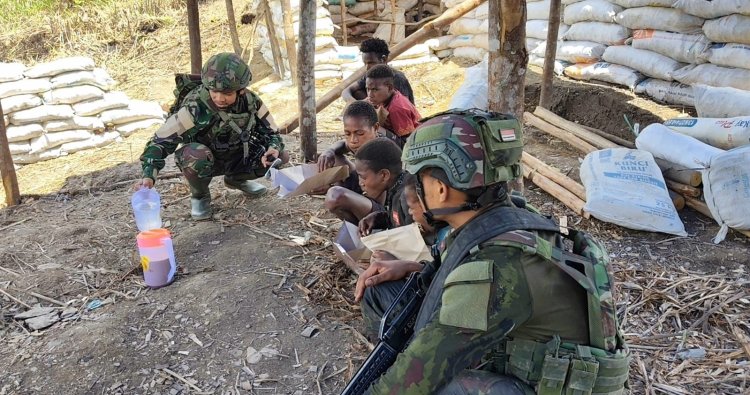 Interaksi hangat antara para prajurit TNI dan anak-anak menjadi pemandangan yang menyentuh hati, menampilkan sisi kemanusiaan Satgas dalam menjalankan tugas pengamanan di medan pegunungan Intan Jaya.