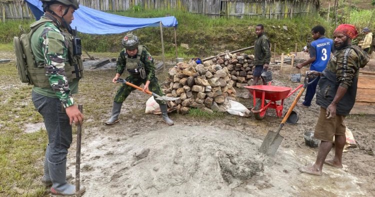 Semangat gotong royong membara saat para prajurit bahu-membahu dengan warga. Mulai dari tahap penggalian fondasi, perakitan rangka, hingga penataan material bangunan, semuanya dilakukan dengan penuh kekeluargaan. Suasana akrab yang tercipta menjadi bukti nyata eratnya jalinan tali persaudaraan antara TNI dan masyarakat Mbua.