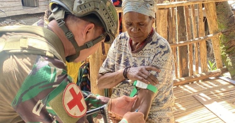 Momen haru tercipta saat seorang tenaga medis Satgas dengan sabar membantu seorang mama Papua lanjut usia yang kesulitan berjalan. Sentuhan kemanusiaan ini menegaskan bahwa hubungan TNI dengan masyarakat Intan Jaya lebih dari sekadar penjagaan perbatasan, melainkan jalinan kekeluargaan yang kuat berlandaskan kepedulian dan kehadiran yang konsisten.