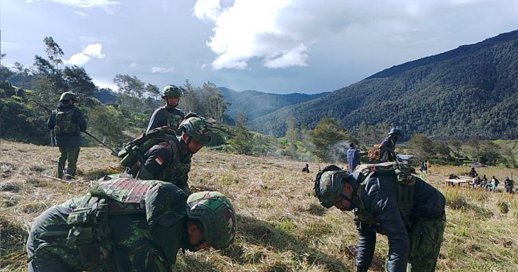 LANNY JAYA - Semangat kebersamaan antara prajurit TNI dan masyarakat kembali terjalin erat di Kampung Wamitu, Distrik Goa Balim, Kabupaten Lanny Jaya, Papua Pegunungan. Personel Satgas Yonif 408/Sbh Pos Wamitu bersama warga setempat bergotong royong membuka dan membersihkan lahan yang akan dijadikan lokasi pembangunan Kantor Distrik Goa Balim, Selasa (4/11/2025).