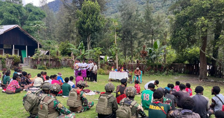 PUNCAK - Di tengah teriknya matahari dan luasnya bentangan alam perbatasan RI-PNG, sebuah pemandangan kehangatan terpancar dari Kampung Julukoma, Distrik Beoga, Kabupaten Puncak, Papua Tengah. Minggu (25/1/2026) menjadi saksi bisu bagaimana personel Pos Julukoma dari Satgas Pamtas RI–PNG Yonif 732/Banau tak hanya menjalankan tugas pengamanan, namun juga merajut kebersamaan melalui kegiatan ibadah Minggu bersama warga setempat.