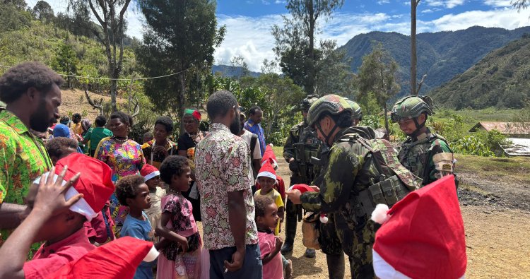 INTAN JAYA - Menjelang momen suci Natal, suasana di Kampung Bilai, Distrik Homeyo, Kabupaten Intan Jaya, semakin terasa hangat berkat kehadiran personel Satgas Pamtas RI PNG Mobile Yonif 113/JS TK dari Pos Bilai. Mereka tidak datang dengan tangan kosong, melainkan membawa kebahagiaan dalam bentuk topi Natal yang dibagikan kepada seluruh warga, tak terkecuali anak-anak.