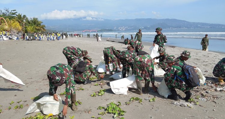 Prajurit Yonif 756/WMS yang dipimpin oleh Letda Inf Andras Ilham Pradana, S.Tr.Han., tampak bersemangat membersihkan area pantai dan sekitarnya. Dengan alat kebersihan sederhana, mereka bersama peserta lain bahu-membahu mengumpulkan sampah plastik dan kotoran yang berserakan di sepanjang garis pantai.