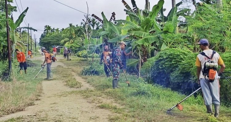 Babinsa bersama masyarakat tampak antusias bergotong royong membersihkan area sekitar, mulai dari memangkas rumput liar, mengangkat sampah, hingga menata kembali lingkungan agar terlihat rapi dan nyaman. Kegiatan berlangsung dalam suasana penuh kebersamaan, mencerminkan sinergi yang kuat antara aparat kewilayahan dan masyarakat binaan.